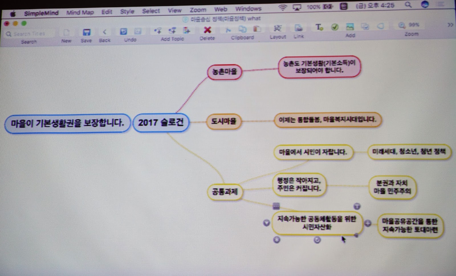 | 사진2. 마을사업이 지향하여야 할 가치와 현실에 대한 고민으로부터 도출된 다양한 2017년 슬로건 |