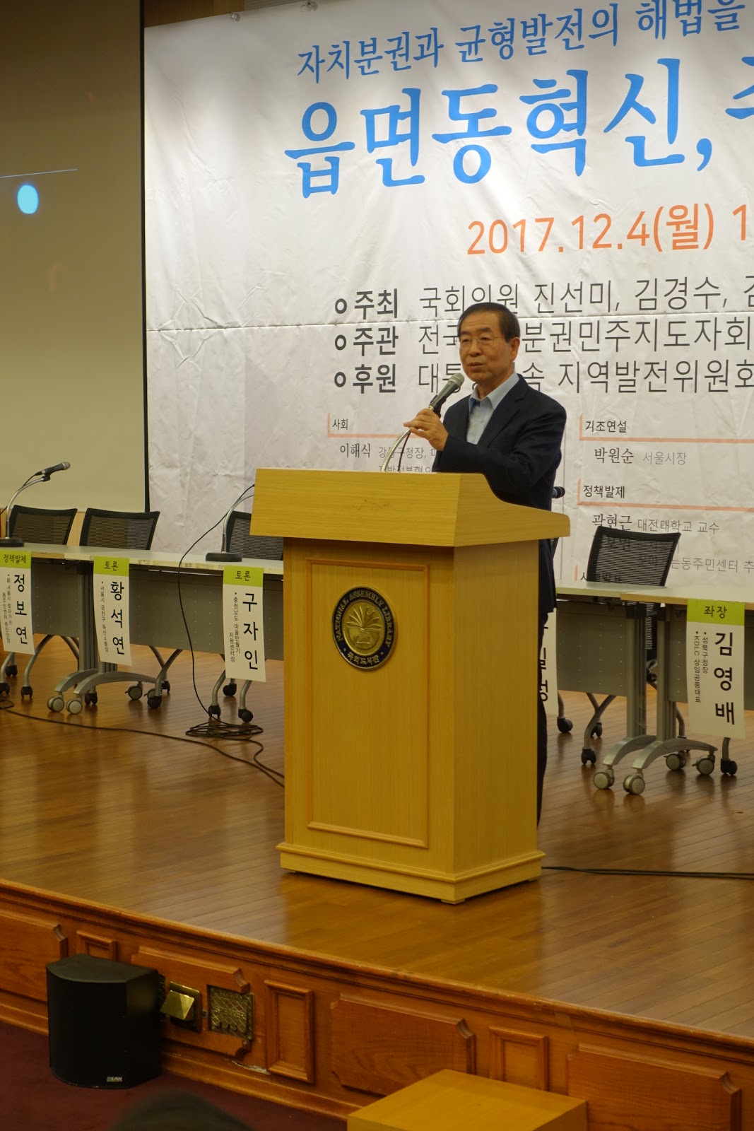 지방분권, 지방자치를 제대로 하려면 제도만으로는 한계가 있다. 이 나라를 살고 있는 우리, 주민의 참여와 자발성에 기초한 결정으로 가능하다. 그러려면 이분들이 모이게 하고, 지역 살림살이에 발언권을 확보하게 해줘야 한다. 읍면동으로부터 훈련하고, 역량을 강화하는 것이 혁신읍면동인데, 예산이 삭감되어서 어렵다. 하지만 시범사업을 1년 더 연장해서라도 꼭 살려보려고 한다. 지방분권 만이 대한민국의 살길이고, 국민의 열망이다.