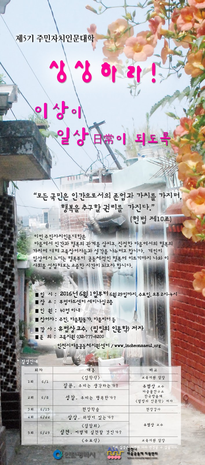 ◎인천광역시: <제 5기 주민자치인문대학> 수강생 모집 (~5/27)
