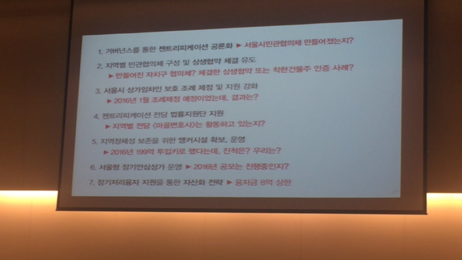 공간 안정화를 위한 후원파티 같은 자구책을 마련해보았지만 부족했기에 서울시 정책들을 알아보았습니다. 공동주택, 로컬펀딩, 더불어민주당의 상가건물임대차보호법까지 모두 살펴봤지만 마을공동체에게는 너무나 멀리 있는 이야기들입니다. 이러던 와중에 15년 12월 서울시 젠트리피케이션 종합대책이 발표되었고, 16년 1월에는 서울시 상가임차인보호조례 제정 예정이었는데 어떻게 되었는지, 199억 투입하기로 한 지역정체성보존을 위한 앵커시설 확보는 어떻게 하기로 했고, 운영 예정이었던 서울형장기안심상가 공모는 시작되었는지, 모두 알 수 없습니다. 우리는 도대체 어디에 매달리면 되는지 묻고 싶습니다.”