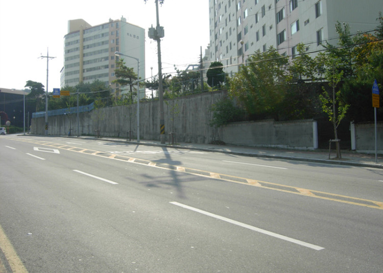 교2동 유화그린맨션 앞 도로변 옹벽이 항상 그늘지고 어두운 느낌을 주고 있다.