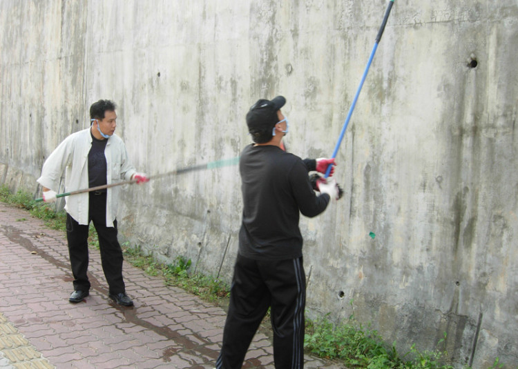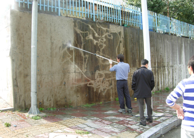 최종 그림 선정에 앞서 벽화를 그릴 대상 옹벽 청소를 교2동사무소의 도움으로 물청소를 실시 하였다.