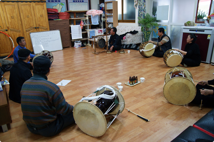 이웃마을에 사시는 관노가면극보전회 사무국장님을 모시고 사물놀이 장단을 익혀가고 계시네요