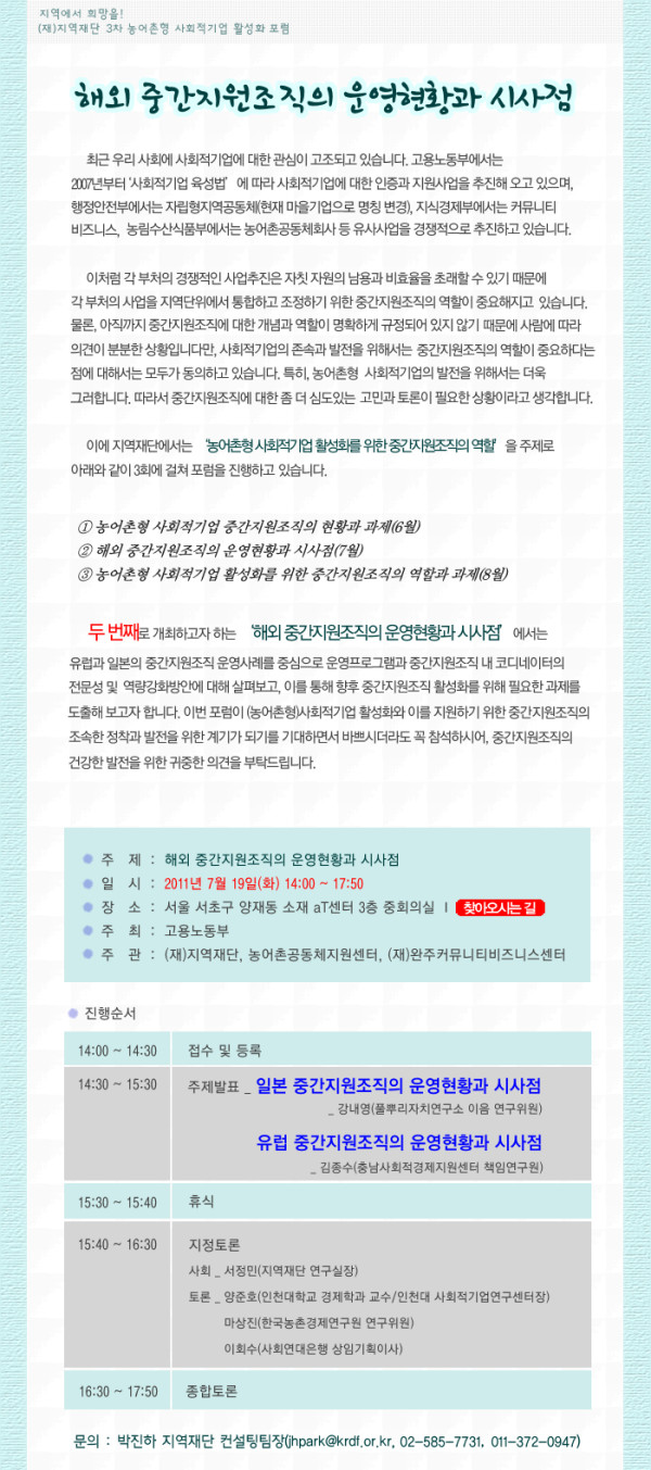 2011년 7월 19일 AT센터에서 진행되었던 농어촌형 사회적기업 활성화 포럼 - 농어촌형 사회적기업 중간지원조직의 현황과 과제 발제문 및 토론문이 포함되어 있습니다. 이번 포럼의 주요 내용은 일본과 유럽지역의 중간지원조직에 대한 내용이 주로 다루어졌습니다.