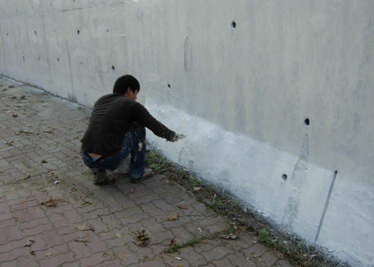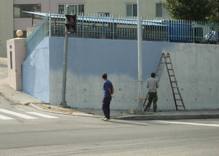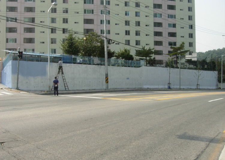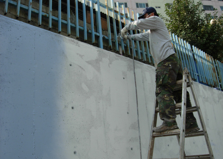 20일 오전 부터 교2동 벽화 대상 옹벽에 전처리 작업인 바탕보수 작업과 푸라이머 시공이 진행되었습니다.