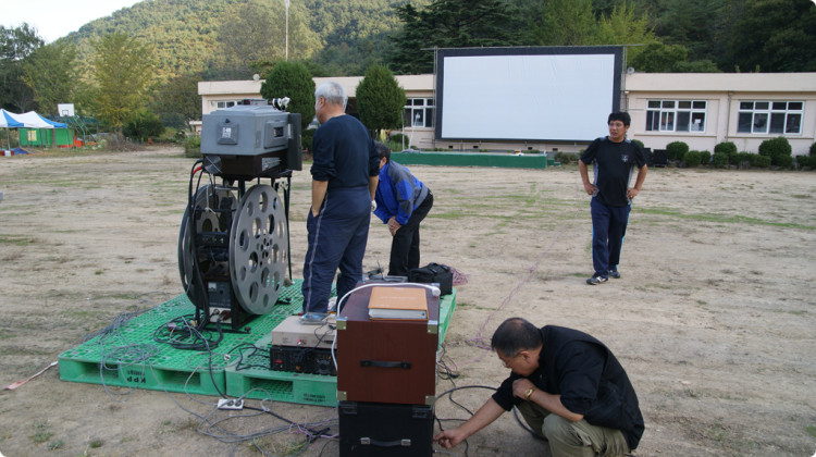 북동리 폐교를 활용한 마을 캠프장에서는 아날로그 영상기와 대형 스크린을 준비하여 극장을 만들고 있습니다.